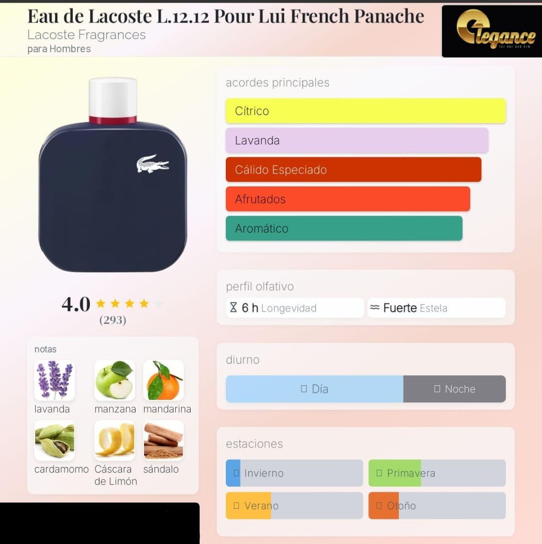 Eau de Lacoste L.12.12 Pour Lui French Panache de Lacoste Fragrances es una fragancia de la familia olfativa Amaderada Aromática para Hombres. Eau de Lacoste L.12.12 Pour Lui French Panache se lanzó en 2019. La Nariz detrás de esta fragrancia es Nelly Hachem-Ruiz. Las Notas de Salida son mandarina, cardamomo y Entusiasmo de limón; las Notas de Corazón son lavanda y manzana; las Notas de Fondo son sándalo, narciso y pachulí.