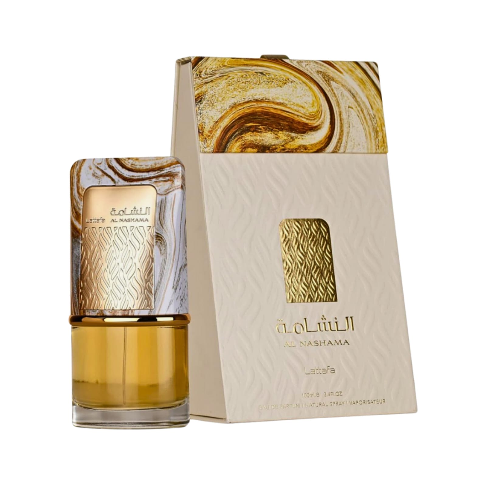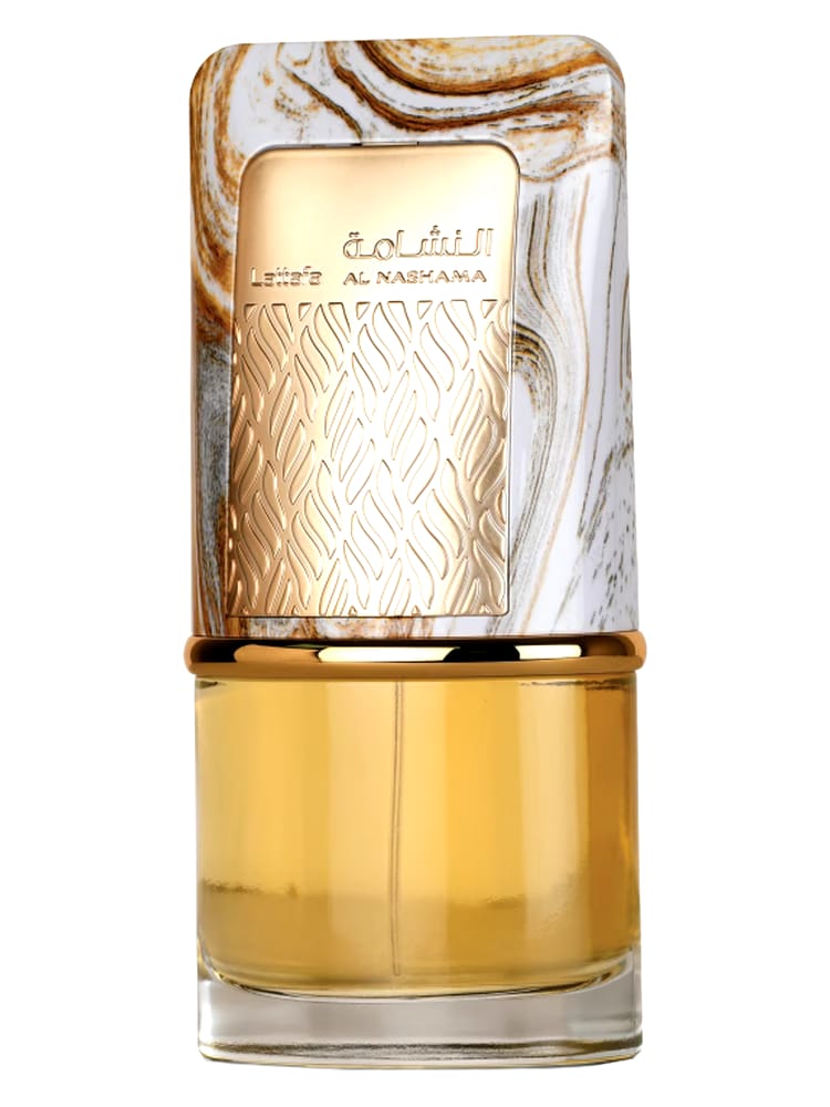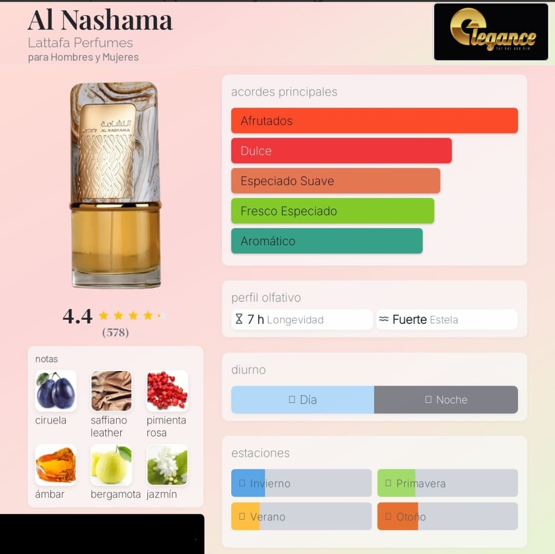 Al Nashama de Lattafa Perfumes es una fragancia de la familia olfativa para Hombres y Mujeres. Esta fragrancia es nueva. Al Nashama se lanzó en 2024. Las Notas de Salida son pimienta rosa, bergamota y salvia; las Notas de Corazón son ciruela, jazmín y pimienta negra; las Notas de Fondo son Cuero Saffiano, ámbar, pachulí y musgo.