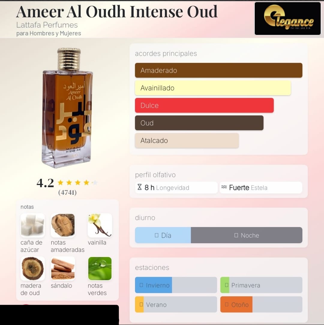 Ameer Al Oudh Intense Oud de Lattafa Perfumes es una fragancia de la familia olfativa Oriental para Hombres y Mujeres. Ameer Al Oudh Intense Oud se lanzó en 2021. Las Notas de Salida son notas amaderadas y madera de oud; las Notas de Corazón son azúcar y vainilla; las Notas de Fondo son madera de oud, sándalo y notas herbales.