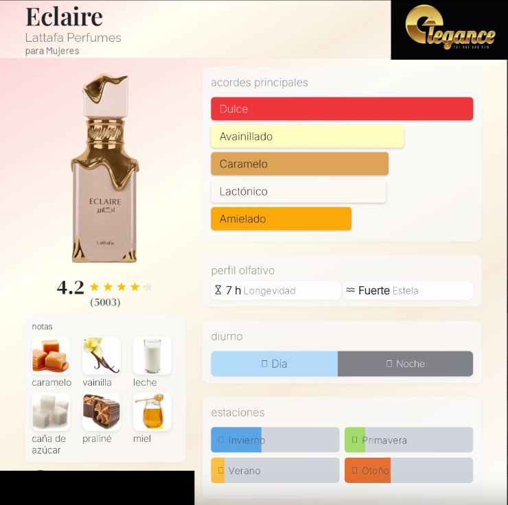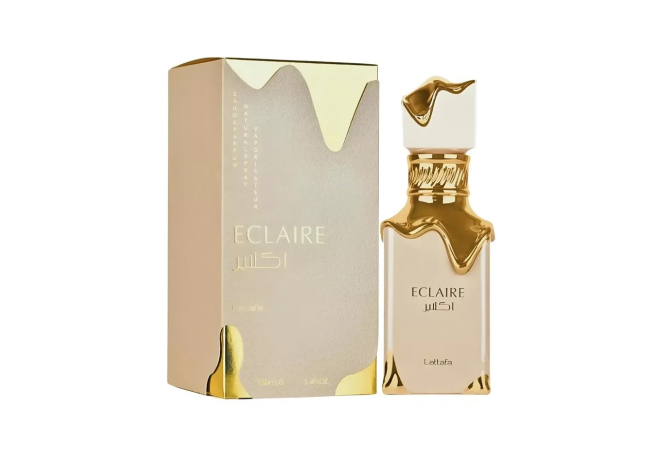 Eclaire de Lattafa Perfumes es una fragancia de la familia olfativa Floral Frutal Gourmand para Mujeres. Esta fragrancia es nueva. Eclaire se lanzó en 2024. Las Notas de Salida son caramelo, leche y azúcar; las Notas de Corazón son miel y flores blancas; las Notas de Fondo son vainilla, praliné y almizcle.