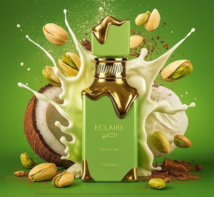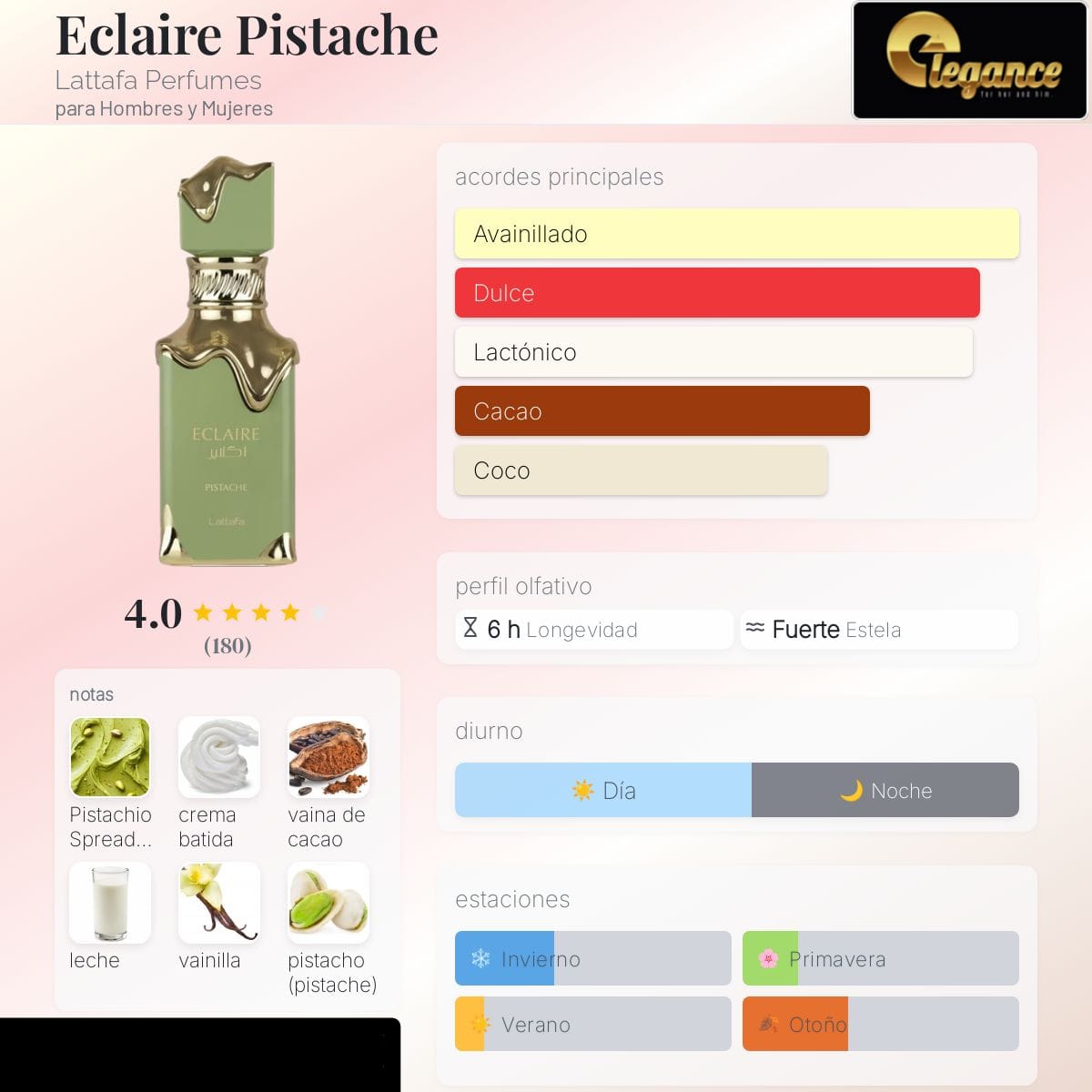 Eclaire Pistache de Lattafa Perfumes es una fragancia de la familia olfativa Oriental Vainilla para Hombres y Mujeres. Esta fragrancia es nueva. Eclaire Pistache se lanzó en 2025. La Nariz detrás de esta fragrancia es Dalia Izem. Las Notas de Salida son Pistachio Spread Cream y pistacho (pistache); las Notas de Corazón son crema batida, cacao y coco; las Notas de Fondo son leche, vainilla y almizcle.
