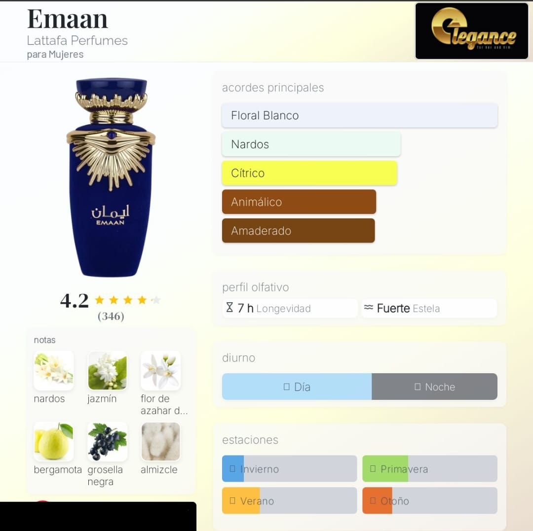 Emaan de Lattafa Perfumes es una fragancia de la familia olfativa Chipre Floral para Mujeres. Esta fragrancia es nueva. Emaan se lanzó en 2022. Las Notas de Salida son flor de azahar del naranjo, bergamota y grosellas negras; las Notas de Corazón son nardos, jazmín y caléndula; las Notas de Fondo son almizcle, vainilla, pachulí y cedro.