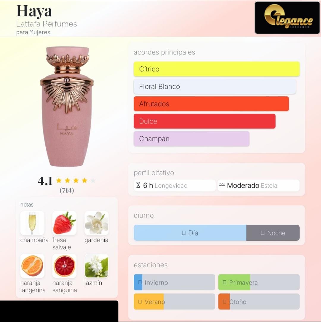 Haya de Lattafa Perfumes es una fragancia de la familia olfativa para Mujeres. Esta fragrancia es nueva. Haya se lanzó en 2022. Las Notas de Salida son champaña, fresa, naranja tangerina, naranja sanguina y rosa; las Notas de Corazón son gardenia, jazmín y orquídea de vainilla; las Notas de Fondo son ámbar, sándalo y castaña.