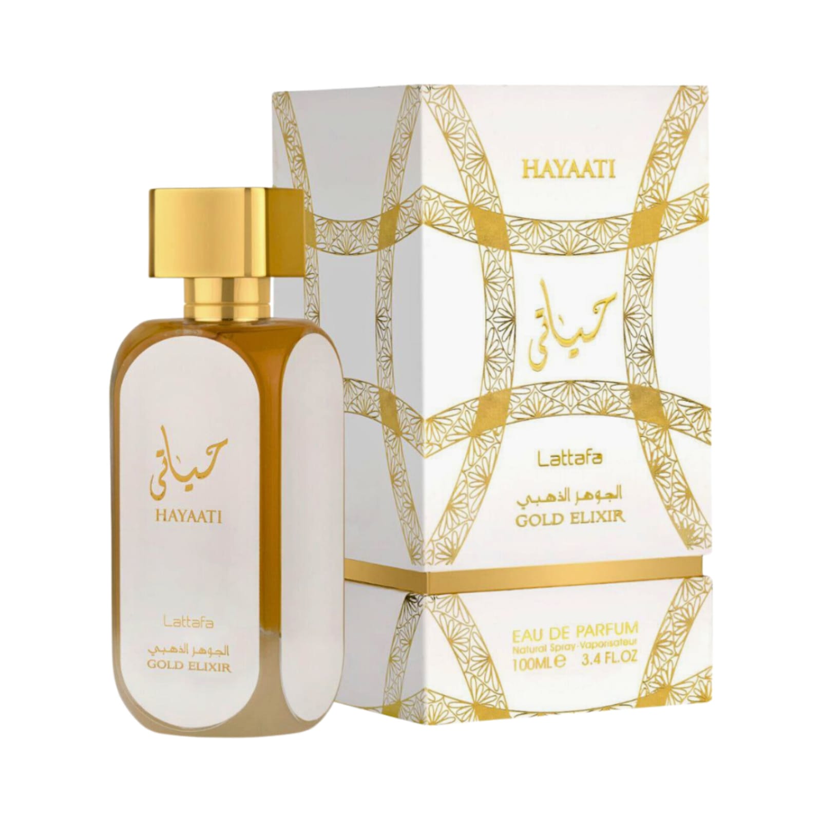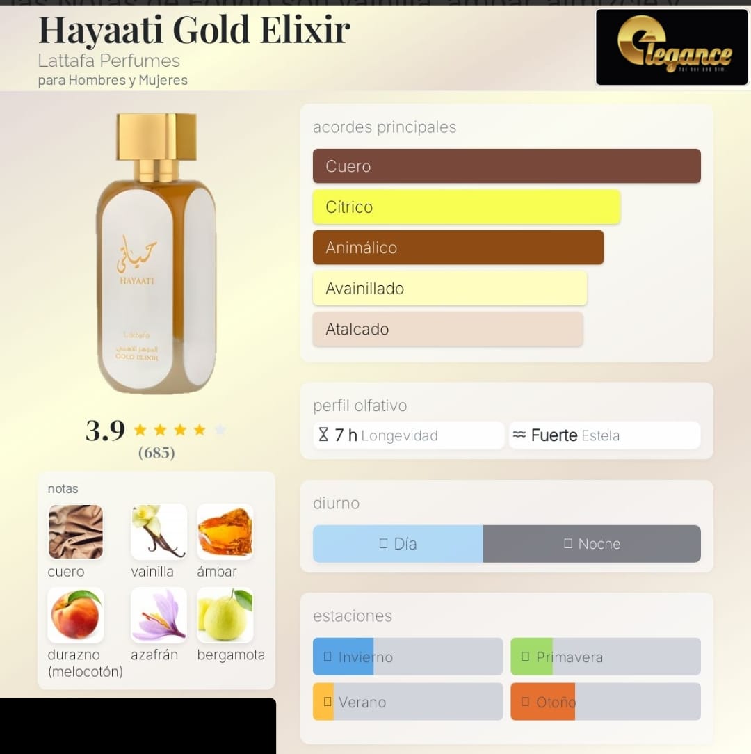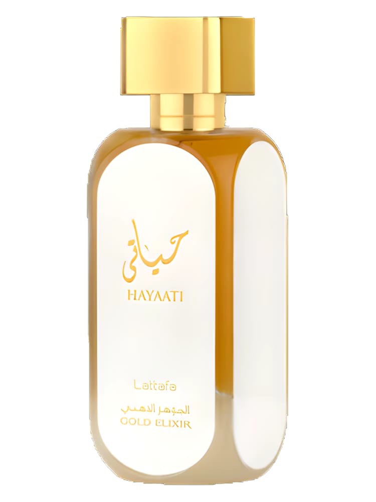Hayaati Gold Elixir de Lattafa Perfumes es una fragancia de la familia olfativa para Hombres y Mujeres. Las Notas de Salida son bergamota, toronja (pomelo) y casis (grosellero negro); las Notas de Corazón son cuero, durazno (melocotón) y azafrán; las Notas de Fondo son vainilla, ámbar, almizcle y vetiver.