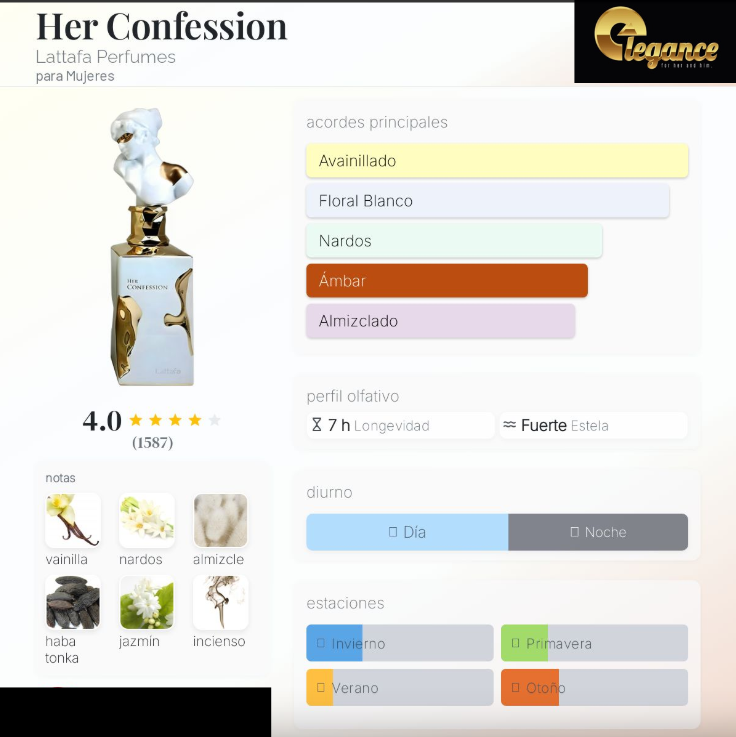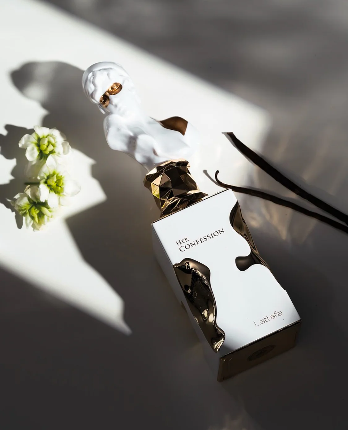 Her Confession de Lattafa Perfumes es una fragancia de la familia olfativa para Mujeres. Esta fragrancia es nueva. Her Confession se lanzó en 2024. Las Notas de Salida son Místico y canela; las Notas de Corazón son nardos, jazmín, incienso y Mahonial; las Notas de Fondo son vainilla, almizcle y haba tonka.