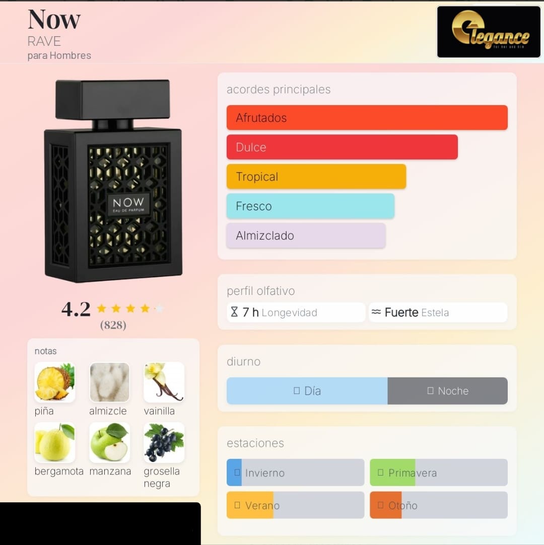 Now de RAVE es una fragancia de la familia olfativa Amaderada Aromática para Hombres. Esta fragrancia es nueva. Now se lanzó en 2022. Las Notas de Salida son piña, bergamota, manzana y grosellas negras; las Notas de Corazón son abedul, pachulí, jazmín de Marruecos y rosa; las Notas de Fondo son almizcle, vainilla, musgo de roble y ámbar gris.
