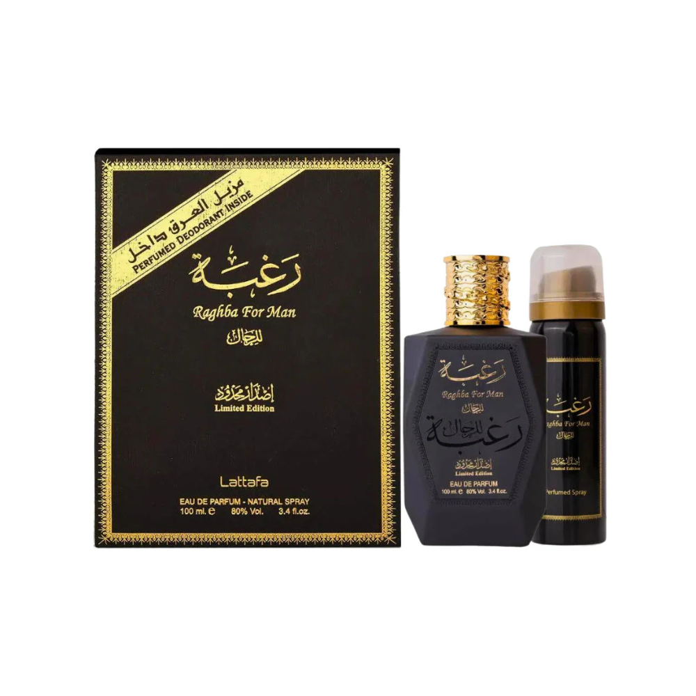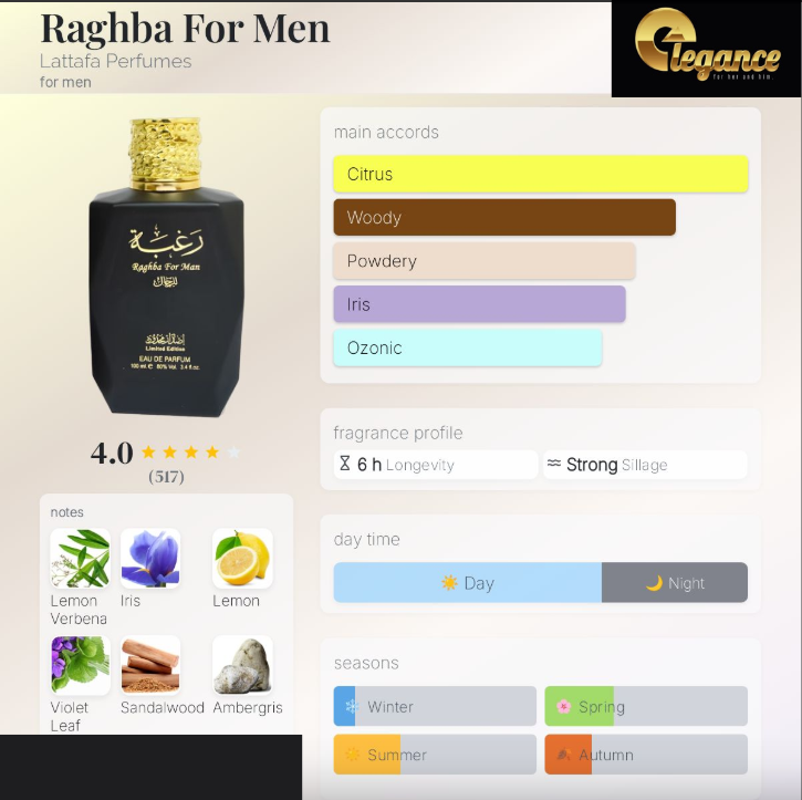 Raghba For Men de Lattafa Perfumes es una fragancia oriental fougère para hombre. Las notas de salida son verbena de limón, iris y limón; la nota de corazón, hojas de violeta; las notas de fondo, sándalo, ámbar gris, cuero y cedro.