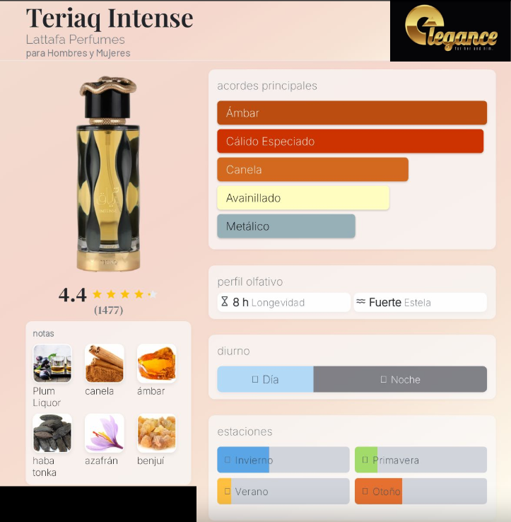 Teriaq Intense de Lattafa Perfumes es una fragancia de la familia olfativa Oriental Especiada para Hombres y Mujeres. Esta fragrancia es nueva. Teriaq Intense se lanzó en 2024. La Nariz detrás de esta fragrancia es Quentin Bisch. Las Notas de Salida son azafrán y bergamota; las Notas de Corazón son Plum Liquor y canela; las Notas de Fondo son ámbar, haba tonka y benjuí.