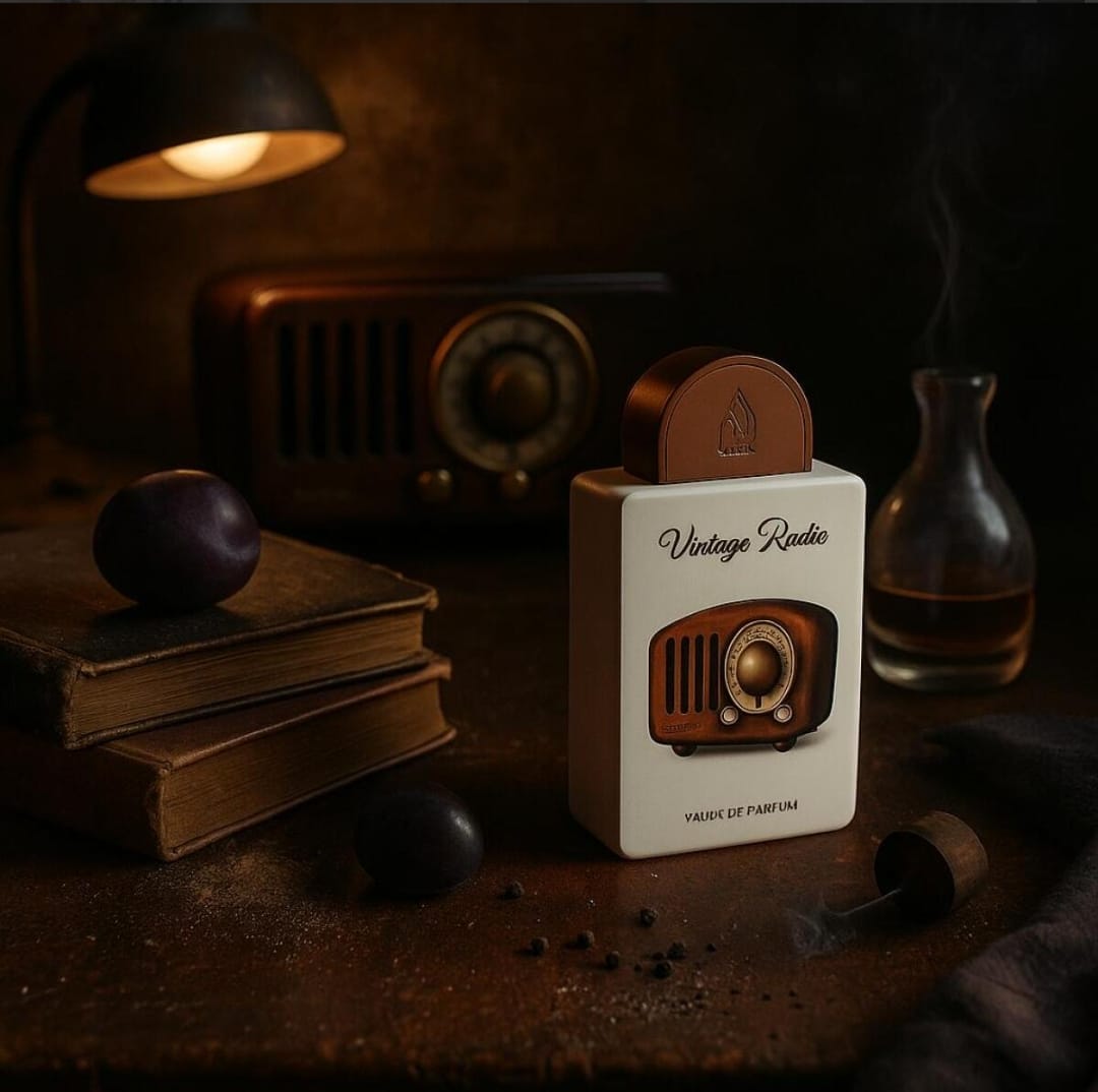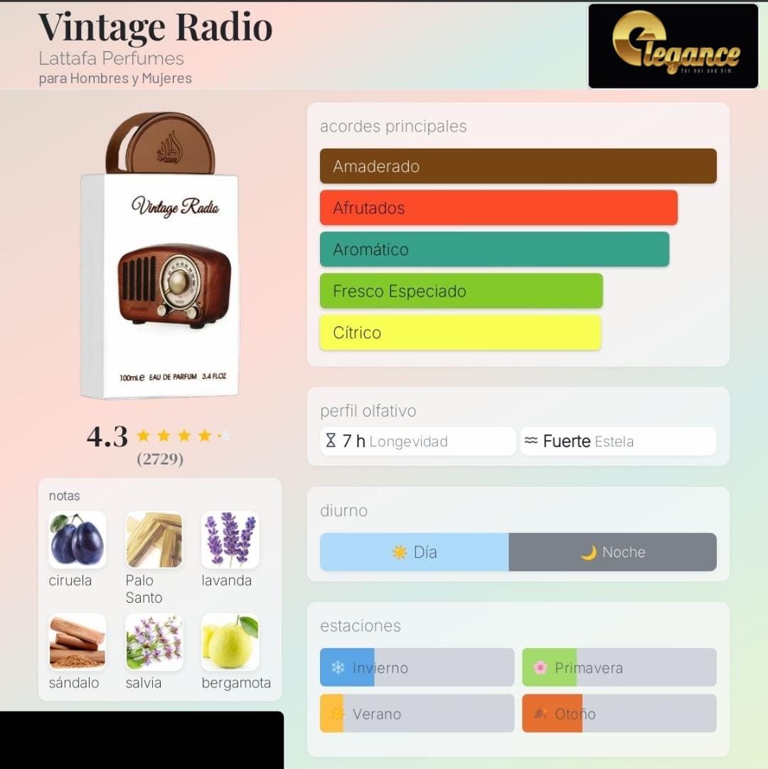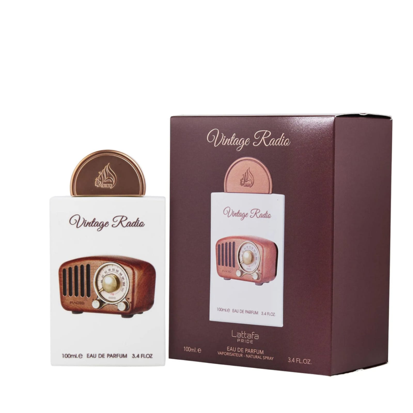 Vintage Radio de Lattafa Perfumes es una fragancia de la familia olfativa Oriental Amaderada para Hombres y Mujeres. Vintage Radio se lanzó en 2023. Las Notas de Salida son lavanda, salvia y bergamota; las Notas de Corazón son ciruela, palo santo y pimienta negra; las Notas de Fondo son sándalo y madera de oud.