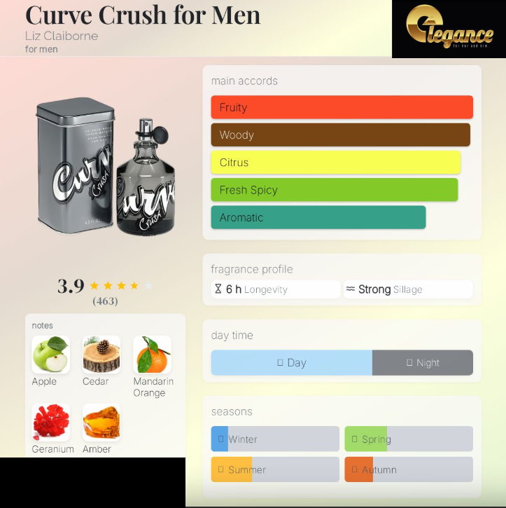 Curve Crush for Men de Liz Claiborne es una fragancia amaderada y acuática para hombre. Curve Crush for Men se lanzó en 2004. Fue creada por Jean-Marc Chaillan y Pascal Gaurin.