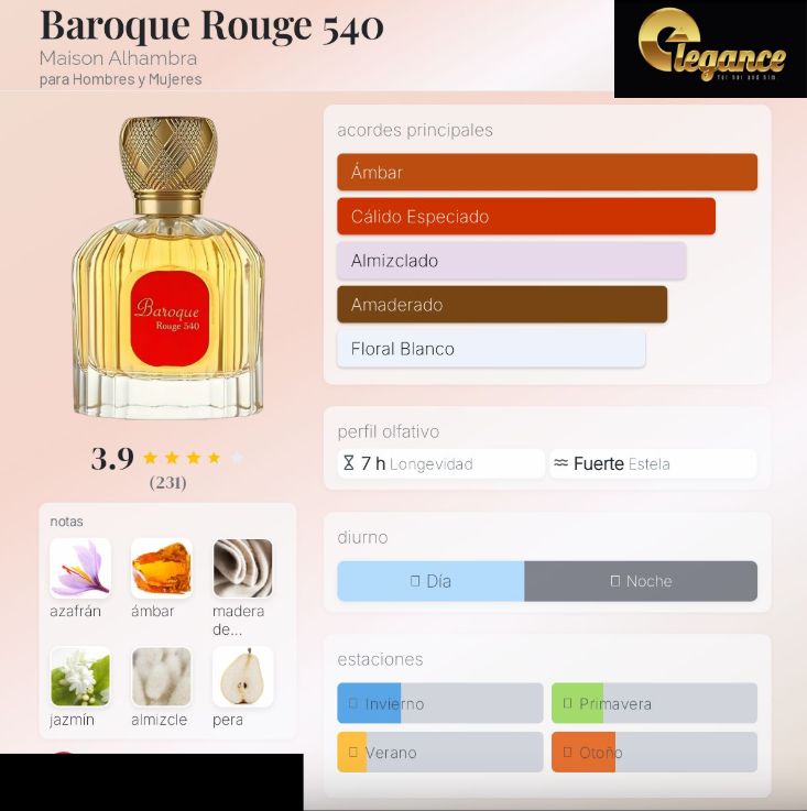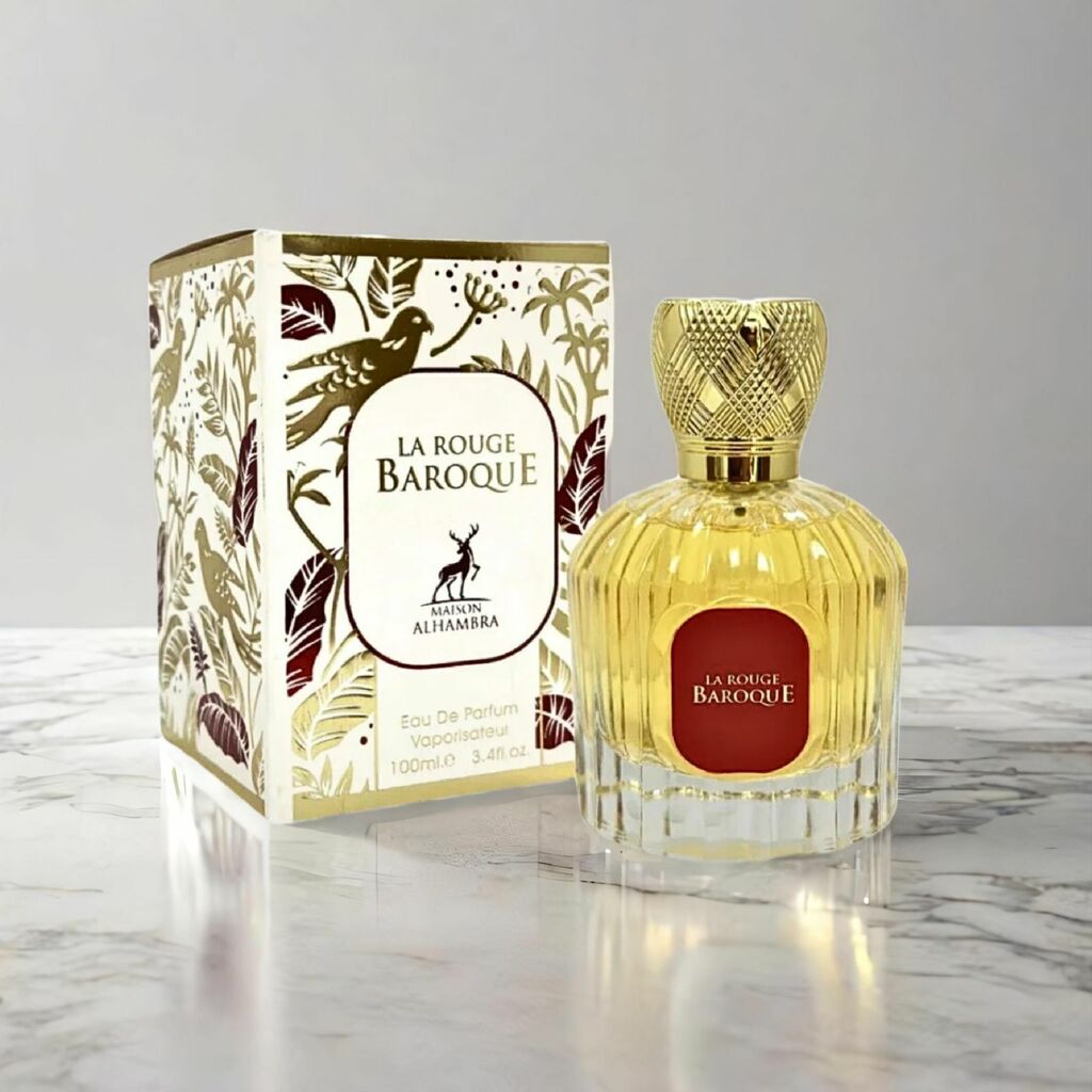 Baroque Rouge 540 de Maison Alhambra es una fragancia de la familia olfativa Oriental para Hombres y Mujeres. Baroque Rouge 540 se lanzó en 2021. Las Notas de Salida son azafrán, pera y mandarina; las Notas de Corazón son jazmín, ylang-ylang y azucena; las Notas de Fondo son madera de cachemira, ámbar y almizcle.