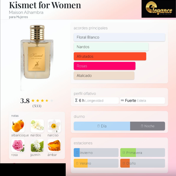 Kismet for Women de Maison Alhambra es una fragancia de la familia olfativa para Mujeres. Las Notas de Salida son chabacano, rosa y jazmín; las Notas de Corazón son nardos y narciso; las Notas de Fondo son ámbar y cedro.