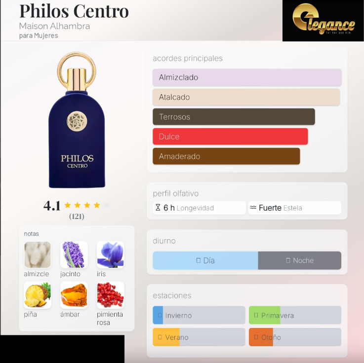 Philos Centro de Maison Alhambra es una fragancia de la familia olfativa Chipre Floral para Mujeres. Philos Centro se lanzó en 2022. Las Notas de Salida son jacinto y piña; las Notas de Corazón son iris, pimienta rosa y jazmín; las Notas de Fondo son almizcle, ámbar, pachulí, vetiver y vainilla.