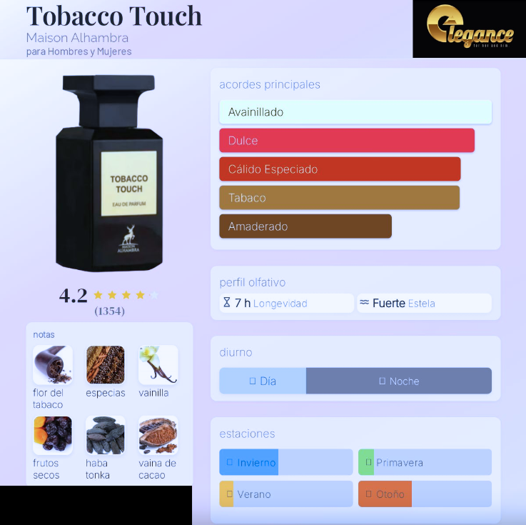Tobacco Touch de Maison Alhambra es una fragancia de la familia olfativa para Hombres y Mujeres. Las Notas de Salida son tabaco y notas especiadas; las Notas de Corazón son tabaco, vainilla, haba tonka y cacao; las Notas de Fondo son frutos secos y notas amaderadas.