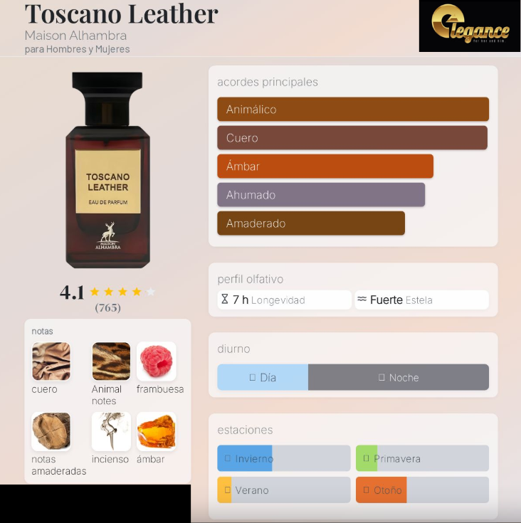 Toscano Leather de Maison Alhambra es una fragancia de la familia olfativa Cuero para Hombres y Mujeres. Toscano Leather se lanzó en 2022. Las Notas de Salida son Notas de animal, azafrán y tomillo; las Notas de Corazón son cuero, frambuesa, notas amaderadas, incienso y jazmín; las Notas de Fondo son cuero y ámbar.