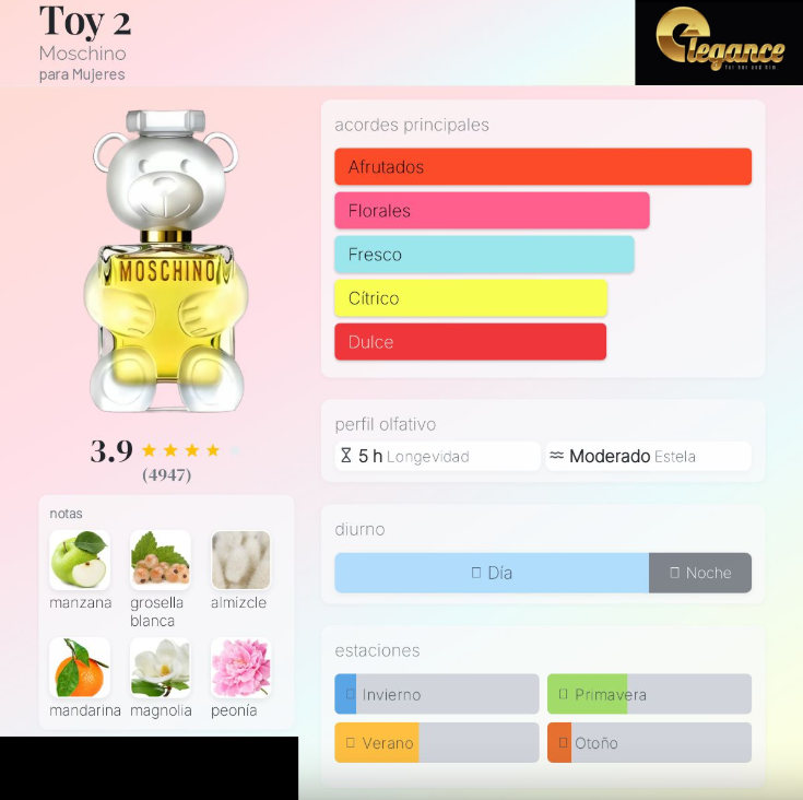 Toy 2 de Moschino es una fragancia de la familia olfativa Almizcle Floral Amaderado para Mujeres. Toy 2 se lanzó en 2018. Toy 2 fue creada por Alberto Morillas y Fabrice Pellegrin. Las Notas de Salida son manzana, mandarina y magnolia; las Notas de Corazón son grosella blanca, peonía y jazmín; las Notas de Fondo son almizcle, sándalo y Amberwood.
