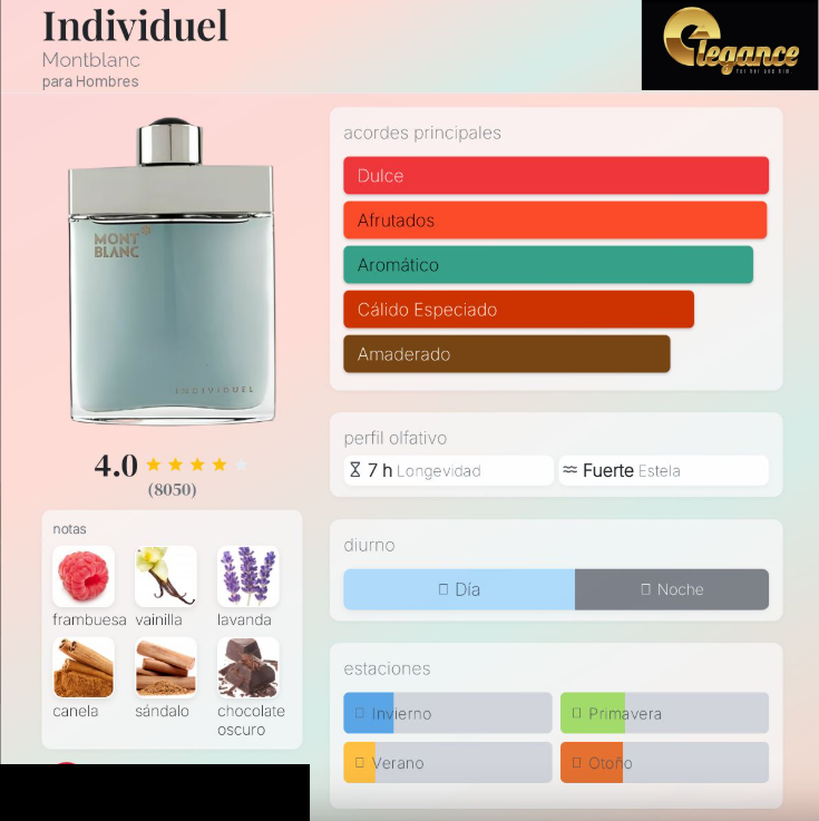 Individuel de Montblanc es una fragancia de la familia olfativa Oriental Amaderada para Hombres. Individuel se lanzó en 2003. La Nariz detrás de esta fragrancia es Pierre Bourdon. Las Notas de Salida son lavanda, canela, piña, bayas de enebro, menta, bergamota, romero, cardamomo y cilantro; las Notas de Corazón son flor de azahar del naranjo, violeta, geranio y jazmín; las Notas de Fondo son frambuesa, vainilla, sándalo, chocolate oscuro, almizcle, ámbar, pachulí, vetiver y musgo de roble.