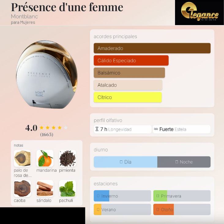 Présence d’une femme de Montblanc es una fragancia de la familia olfativa Oriental Vainilla para Mujeres. Présence d’une femme se lanzó en 2002. La Nariz detrás de esta fragrancia es Michel Almairac. Las Notas de Salida son mandarina y pimienta; las Notas de Corazón son orquídea y ciclamen (violeta persa); las Notas de Fondo son palo de rosa de Brasil, caoba, sándalo, pachulí y flor de vainilla.