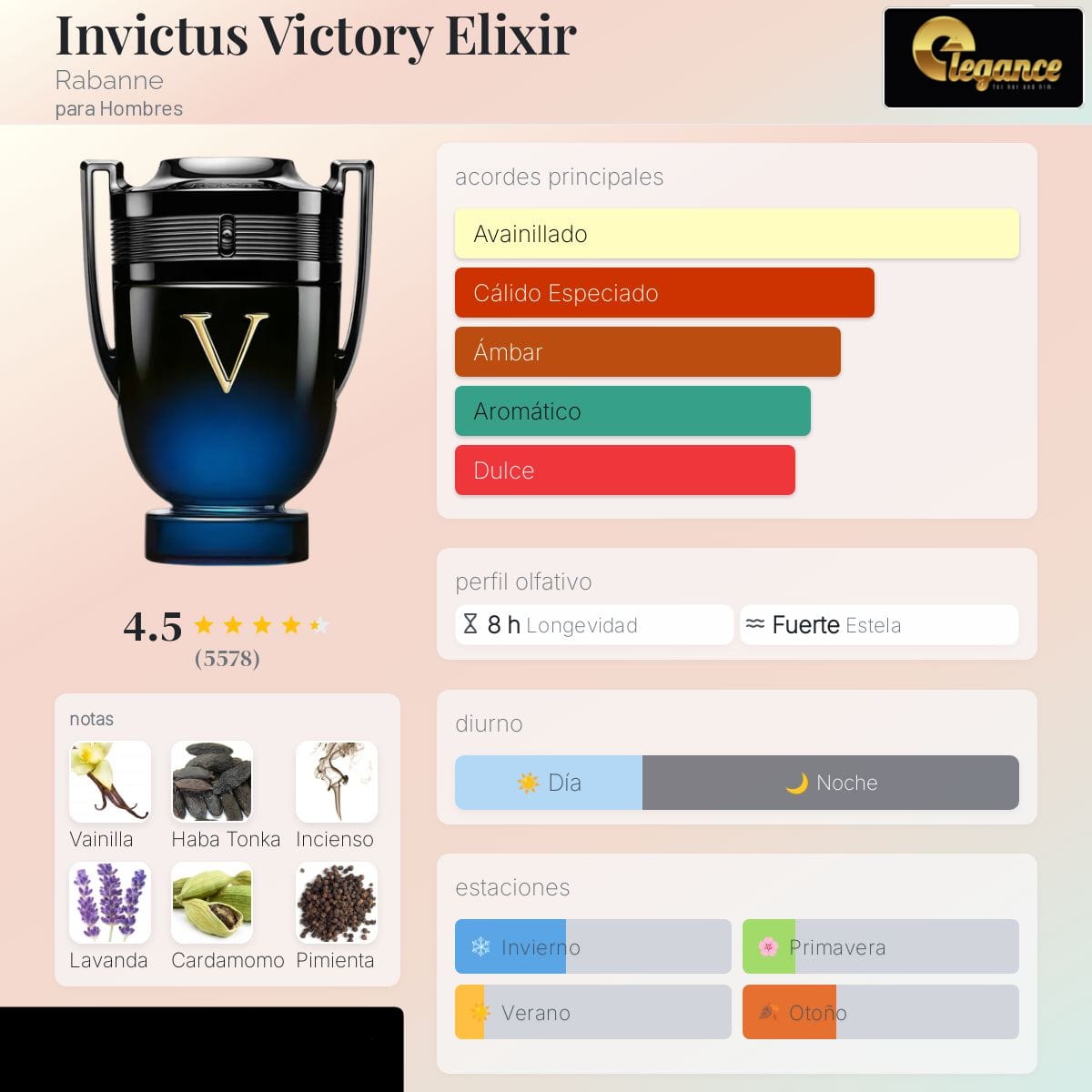 Invictus Victory Elixir de Rabanne es una fragancia de la familia olfativa Oriental Amaderada para Hombres. Invictus Victory Elixir se lanzó en 2023. Invictus Victory Elixir fue creada por Domitille Michalon Bertier, Anne Flipo y Nicolas Beaulieu. Las Notas de Salida son lavanda, cardamomo y pimienta negra; las Notas de Corazón son incienso y pachulí; las Notas de Fondo son vaina de vainilla y haba tonka.