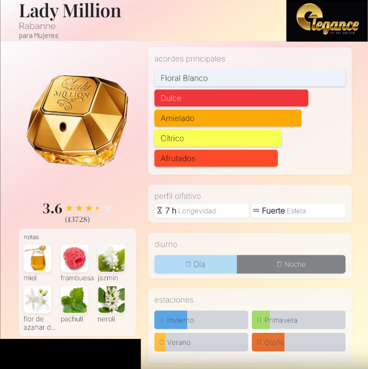 Lady Million de Rabanne es una fragancia de la familia olfativa Floral Frutal para Mujeres. Lady Million se lanzó en 2010. Lady Million fue creada por Anne Flipo, Beatrice Piquet, Dominique Ropion y Bruno Jovanovic. Las Notas de Salida son frambuesa, neroli y limón de Amalfi (lima de Amalfi); las Notas de Corazón son jazmín, flor del naranjo africano y gardenia; las Notas de Fondo son miel blanca, pachulí y ámbar.