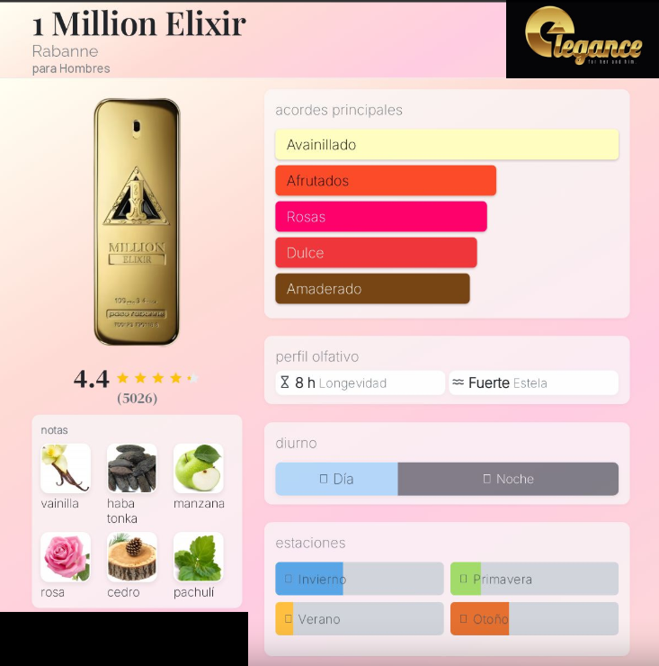 1 Million Elixir de Rabanne es una fragancia de la familia olfativa Amaderada Aromática para Hombres. Esta fragrancia es nueva. 1 Million Elixir se lanzó en 2022. Las Notas de Salida son manzana y Davana; las Notas de Corazón son rosa de Damasco, cedro y osmanto (olivo oloroso); las Notas de Fondo son absoluto de vainilla, haba tonka y pachulí.