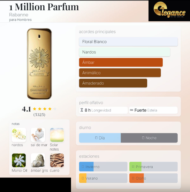 1 Million Parfum de Rabanne es una fragancia de la familia olfativa Cuero para Hombres. 1 Million Parfum se lanzó en 2020. 1 Million Parfum fue creada por Quentin Bisch, Christophe Raynaud y Sonia Constant.