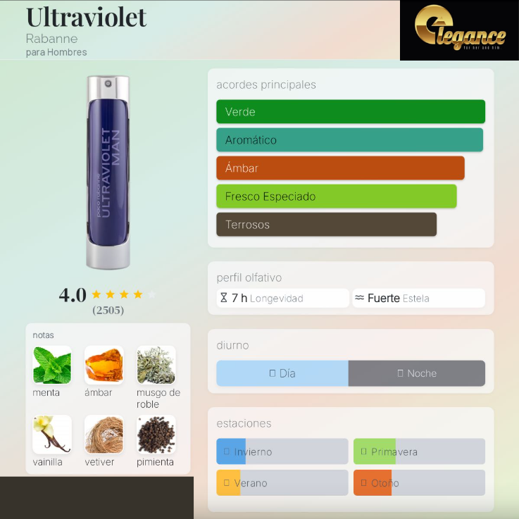 Ultraviolet de Rabanne es una fragancia de la familia olfativa Oriental Amaderada para Hombres. Ultraviolet se lanzó en 2001. La Nariz detrás de esta fragrancia es Jacques Cavallier Belletrud. Las Notas de Salida son menta y ámbar; las Notas de Corazón son vetiver, pimienta y notas especiadas; las Notas de Fondo son musgo de roble y vainilla.