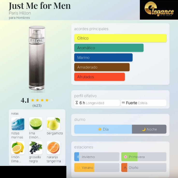 Just Me for Men de Paris Hilton es una fragancia de la familia olfativa Aromática Acuática para Hombres. Just Me for Men se lanzó en 2006. La Nariz detrás de esta fragrancia es Jean-Louis Grauby. Las Notas de Salida son lima (limón verde), bergamota, limón (lima ácida), grosellas negras, naranja tangerina y hierba verde; las Notas de Corazón son notas marinas, flor de loto, salvia, clavos de olor y nuez moscada; las Notas de Fondo son caoba, incienso, musgo de roble, pachulí y ámbar cristalino.
