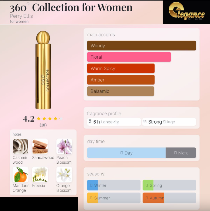 360° Collection for Women by Perry Ellis is a Floral fragrance for women. 360° Collection for Women was launched in 2014. Top notes are Blood Mandarin, Freesia, Orange Blossom and Green Anjou Pears; middle notes are Cashmere Wood, Peach Blossom and Orchid; base notes are Sandalwood, Benzoin, Vanilla Absolute and Patchouli.