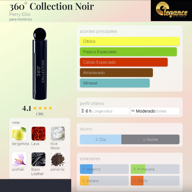 360° Collection Noir de Perry Ellis es una fragancia de la familia olfativa Cuero para Hombres. 360° Collection Noir se lanzó en 2017. Las Notas de Salida son bergamota y Agua de arroz; las Notas de Corazón son Lava, azafrán y pimienta negra; las Notas de Fondo son Cuero negro, notas amaderadas y ámbar.