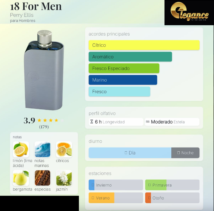 18 For Men de Perry Ellis es una fragancia de la familia olfativa Aromática Fougère para Hombres. 18 For Men se lanzó en 2006.