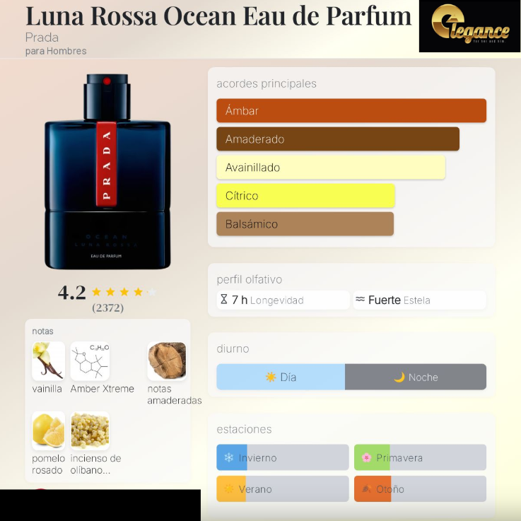 Luna Rossa Ocean Eau de Parfum de Prada es una fragancia de la familia olfativa Oriental Amaderada para Hombres. Esta fragrancia es nueva. Luna Rossa Ocean Eau de Parfum se lanzó en 2023. Luna Rossa Ocean Eau de Parfum fue creada por Anne Flipo y Carlos Benaïm. La Nota de Salida es toronja (pomelo); las Notas de Corazón son notas amaderadas y Incienso; las Notas de Fondo son vainilla y Amber Xtreme.