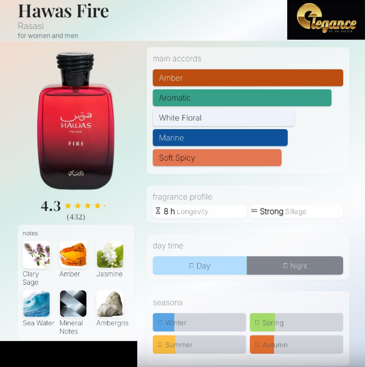 Hawas Fire by Rasasi is a Aromatic Aquatic fragrance for women and men. This is a new fragrance. Hawas Fire was launched in 2025. Top note is Clary Sage; middle notes are Egyptian Jasmine and Marine notes; base notes are Amber, Mineral notes and Ambergris.