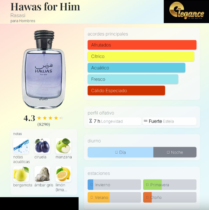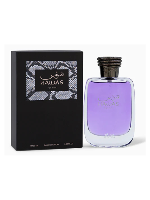 Hawas for Him de Rasasi es una fragancia de la familia olfativa Aromática Acuática para Hombres. Hawas for Him se lanzó en 2015. Las Notas de Salida son manzana, bergamota, limón (lima ácida) y canela; las Notas de Corazón son notas acuosas, ciruela, flor de azahar del naranjo y cardamomo; las Notas de Fondo son ámbar gris, almizcle, pachulí y trozos de madera a la deriva.