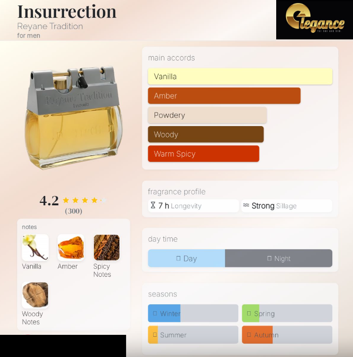 Insurrection Classique es la potencia francesa, la fragancia más original y reconocida de la línea de Reyane Tradition. Es la personificación del éxito de un hombre, con la dulce, sutileza de su masculinidad. Insurrection Classique es para el hombre que se siente cómodo y confiado en su propia piel. Arriba: Vainilla, Balsámico Medio: Amber Base: Musgo de roble, Pimienta, Pachulí