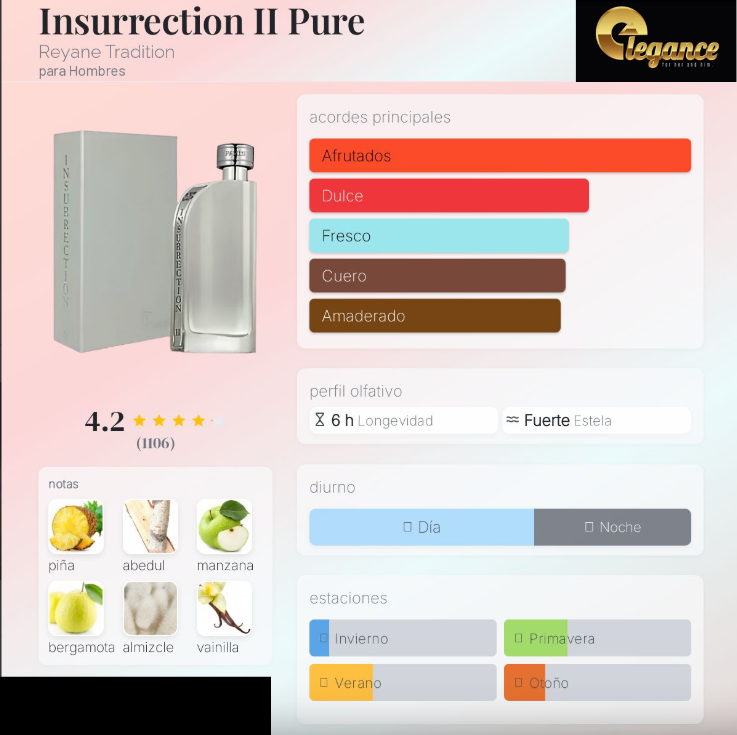 Insurrection II Pure de Reyane Tradition es una fragancia de la familia olfativa Amaderada Aromática para Hombres. Insurrection II Pure se lanzó en 2013. Las Notas de Salida son piña, manzana, bergamota y casis (grosellero negro); las Notas de Corazón son abedul, pachulí y jazmín; las Notas de Fondo son almizcle, vainilla, musgo de roble y ámbar.
