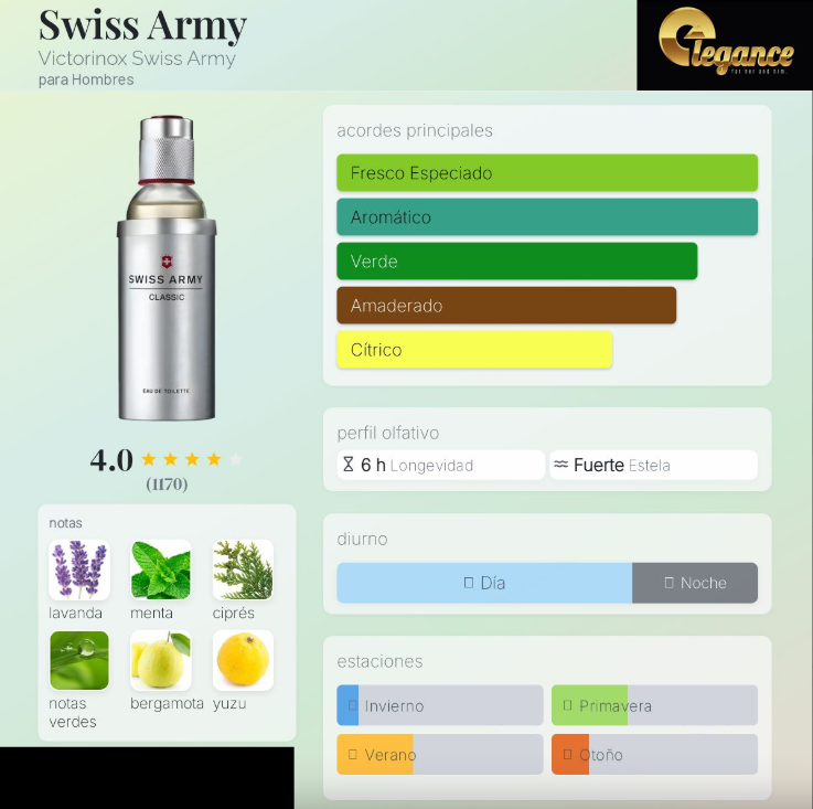 Swiss Army de Victorinox Swiss Army es una fragancia de la familia olfativa Amaderada Aromática para Hombres. Swiss Army se lanzó en 1997. Las Notas de Salida son menta, notas verdes, bergamota, yuzu y jengibre; las Notas de Corazón son lavanda, romero, hojas de violeta, flor de las nieves (flor de edelweiss) y geranio; las Notas de Fondo son ciprés, abeto balsámico, cedro, almizcle y ámbar.