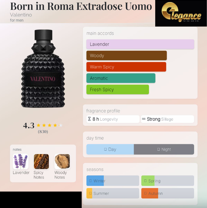 Born in Roma Extradose Uomo de Valentino es una fragancia para hombre. Esta nueva fragancia se lanzó en 2025. Su nota de salida es especiada, su nota de corazón es lavanda silvestre y su nota de fondo es amaderada.