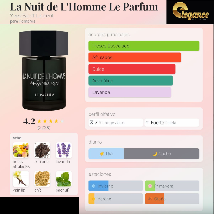 La Nuit de L’Homme Le Parfum de Yves Saint Laurent es una fragancia de la familia olfativa Oriental Fougère para Hombres. La Nuit de L’Homme Le Parfum se lanzó en 2010. Las Notas de Salida son pimienta, anís y bergamota; las Notas de Corazón son notas afrutadas, lavanda y ládano francés; las Notas de Fondo son vainilla, pachulí y vetiver.