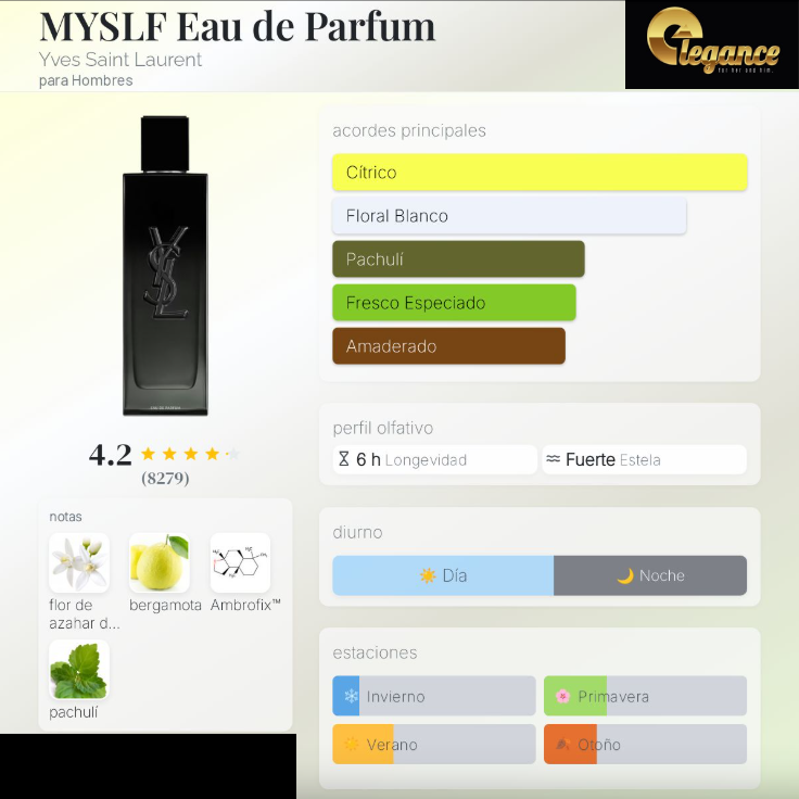 MYSLF Eau de Parfum de Yves Saint Laurent es una fragancia de la familia olfativa Aromática para Hombres. Esta fragrancia es nueva. MYSLF Eau de Parfum se lanzó en 2023. MYSLF Eau de Parfum fue creada por Christophe Raynaud, Antoine Maisondieu y Daniela Andrier. Las Notas de Salida son bergamota de Calabria y bergamota; la Nota de Corazón es flor del naranjo tunesino; las Notas de Fondo son Ambrofix™ y pachulí.